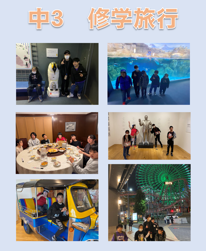 中学部3年生が横浜方面に修学旅行に行きました。八景島シーパラダイス、カップヌードルミュージアムを見学しました。エアキャビンに乗ったり、中華街で食事をしたりと、県内では味わうことはできない貴重な体験ができました。