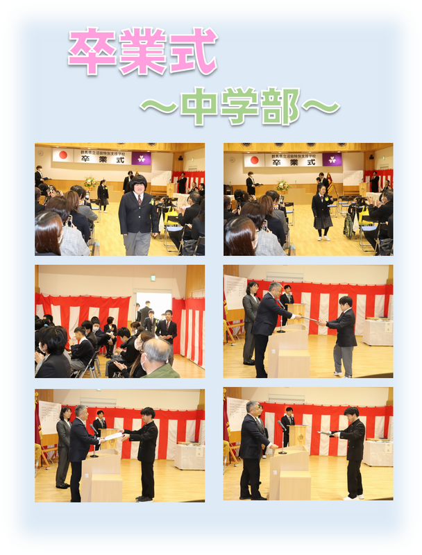 中学部3年生が6人卒業しました。厳かな雰囲気の中、一人一人が堂々と校長先生から卒業証書を受け取ることができました。6人の今後の活躍を中学部職員応援しています。