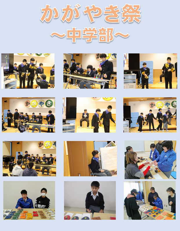 中学部は「カントリーロード」の合奏と「手をつなごう」のダンスを発表しました。たくさんのお客さんに見て頂けて、緊張する生徒も多くいましたが最高の発表ができました。革製品の販売では笑顔で接客する姿が多く見られました。